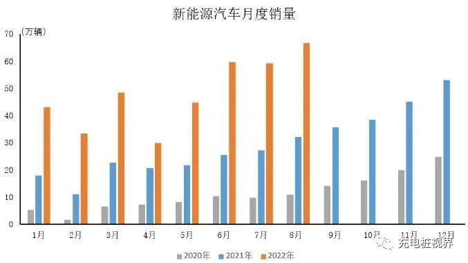 2022年8月,新能源汽車產(chǎn)銷產(chǎn)銷再創(chuàng)歷史新高、分別完成69.1萬輛和66.6萬輛,產(chǎn)銷同比分別增長1.2倍和1倍。