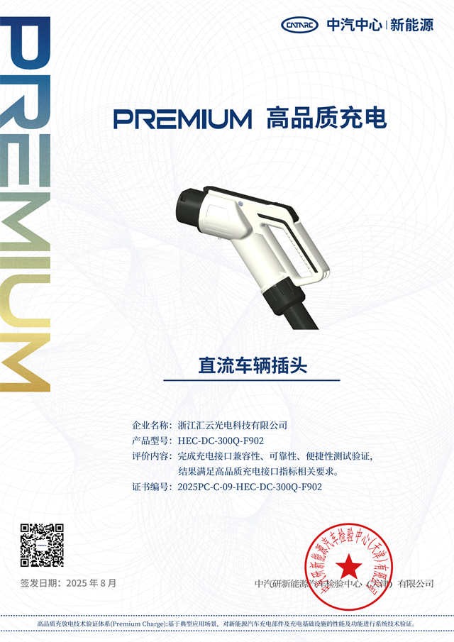 ? ? 近日,浙江匯云光電科技有限公司(以下簡(jiǎn)稱 “匯云科技”)自主研發(fā)的系列充電插頭產(chǎn)品順利通過(guò)中國(guó)汽車工程研究院(中汽研)“高品質(zhì)充電” 認(rèn)證。該認(rèn)證涵蓋兼容性、可靠性、便捷性等核心維度的嚴(yán)苛測(cè)試,標(biāo)志著匯云科技充電接口在技術(shù)標(biāo)準(zhǔn)與用戶體驗(yàn)上已達(dá)到行業(yè)標(biāo)桿水平,為新能源充電基礎(chǔ)設(shè)施高質(zhì)量發(fā)展注入新動(dòng)能。